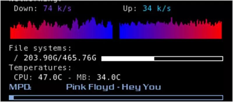 Conky 能监视很多的操作系统数据。它支持 IMAP 和 POP3, 甚至许多流行的音乐播放器!出于方便不同的人,你可以使用自己的 Lua 脚本或程序来进行扩展。