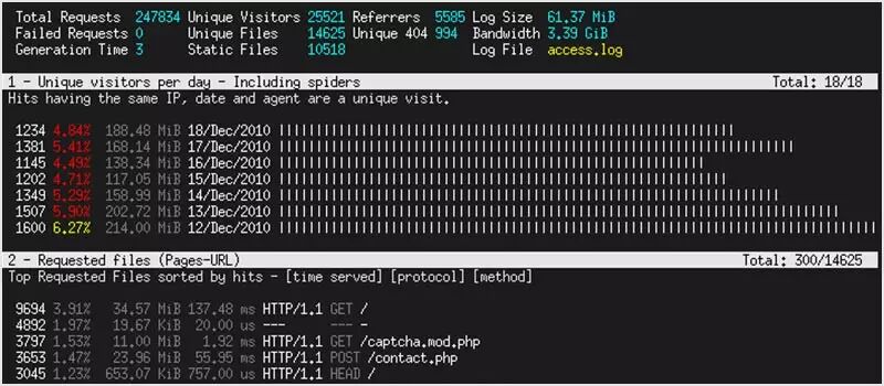 GoAccess 是一个实时的网络日志分析器,它能分析 apache, nginx 和 amazon cloudfront 的访问日志。它也可以将数据输出成 HTML,JSON 或 CSV 格式。它会给你一个基本的统计信息、访问量、404 页面,访客位置和其他东西。