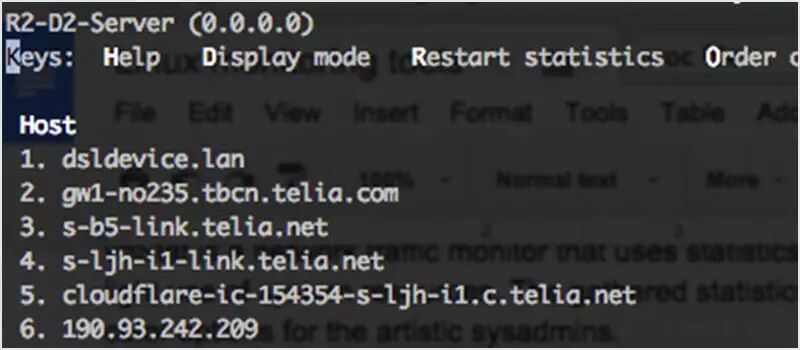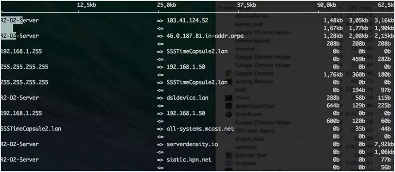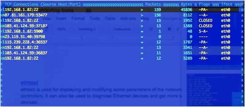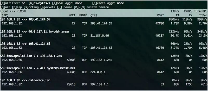 iftop 类似于 top,但它主要不是检查 cpu 的使用率而是监听所选择网络接口的流量,并以表格的形式显示当前的使用量。像“为什么我的网速这么慢呢?!”这样的问题它可以直接回答。