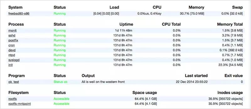 如果出现故障时,monit 有发送警报以及重新启动服务的功能。它可以对各种数据进行检查,你可以为 monit 写一个脚本,它有一个 Web 用户界面来分担你眼睛的压力。