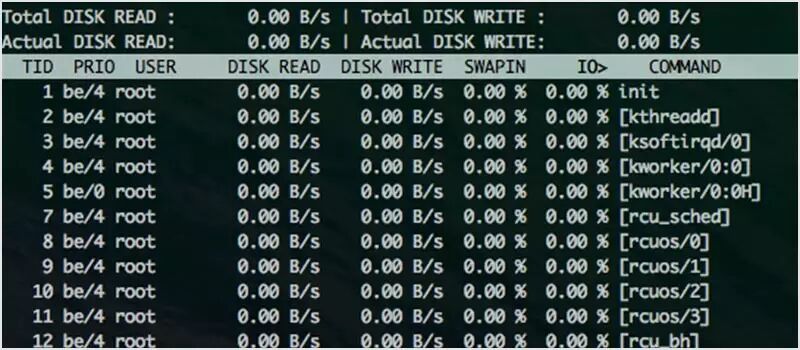 iotop 用于检查 I/O 的使用情况,并为你提供了一个类似 top 的界面来显示。它按列显示读和写的速率,每行代表一个进程。当发生交换或 I/O 等待时,它会显示进程消耗时间的百分比。