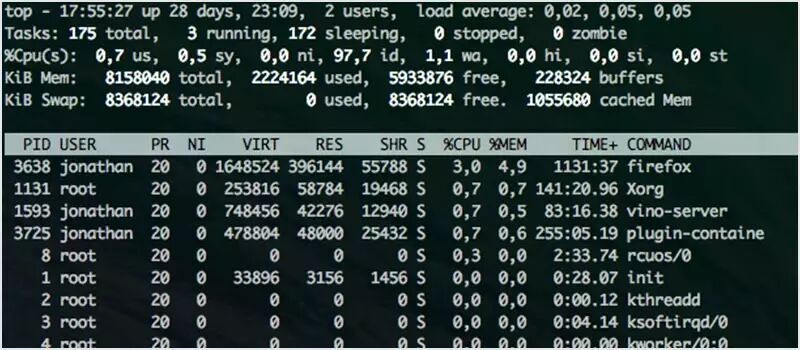 这是一个被预装在许多 UNIX 系统中的小工具。当你想要查看在系统中运行的进程或线程时:top 是一个很好的工具。你可以对这些进程以不同的方式进行排序,默认是以 CPU 进行排序的。