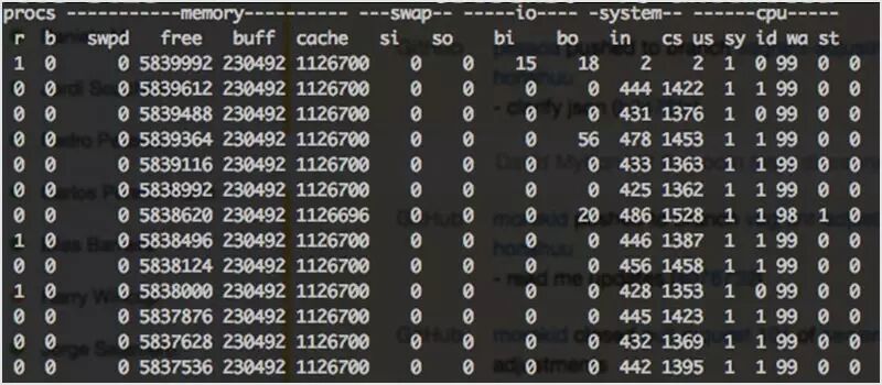 vmstat(virtual memory statistics)是一个小型内置工具,能监控和显示机器的内存。