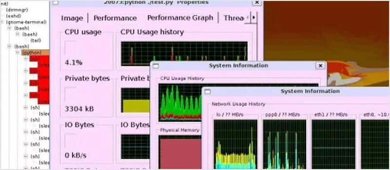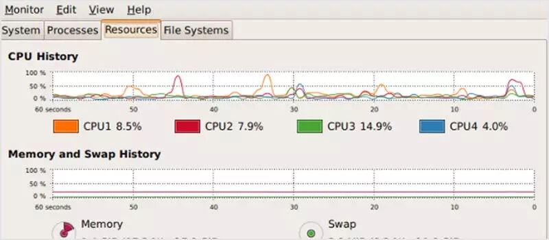 Gnome 系统监控器是一个基本的系统监控工具,其能通过一个树状结构来查看进程的依赖关系,能杀死进程及调整进程优先级,还能以图表形式显示所有服务器的指标。
