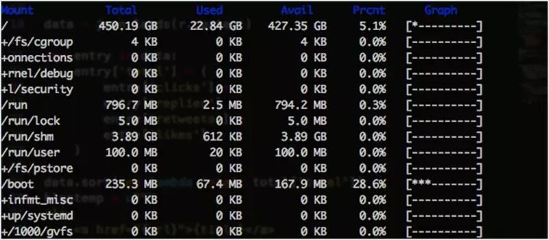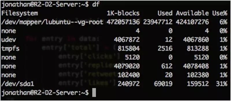 df 是 disk free 的缩写,它是所有 UNIX 系统预装的程序,用来显示用户有访问权限的文件系统的可用磁盘空间。