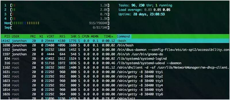 htop 实质上是 top 的一个增强版本。它更容易对进程排序。它看起来上更容易理解,并且已经内建了许多通用操作。它也是完全交互式的。