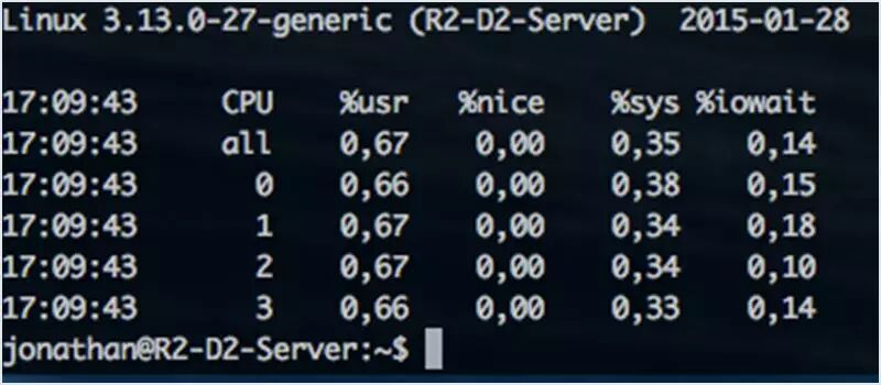 mpstat 是一个内置的工具,能监视 cpu 的使用情况。最常见的使用方法是 mpstat -P ALL,它给你提供 cpu 的使用情况。你也可以间歇性地更新 cpu 的使用情况。