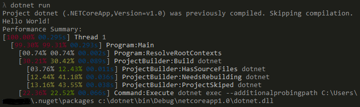 那么,现在有了新的、跨平台的CoreCLR和CLI工具之后,事情会发生什么变化呢? 首先,要了解幕后情况,我们需要设置一些环境变量(COREHOST_TRACE和DOTNET_CLI_CAPTURE_TIMING),以便获得更详细的输出: