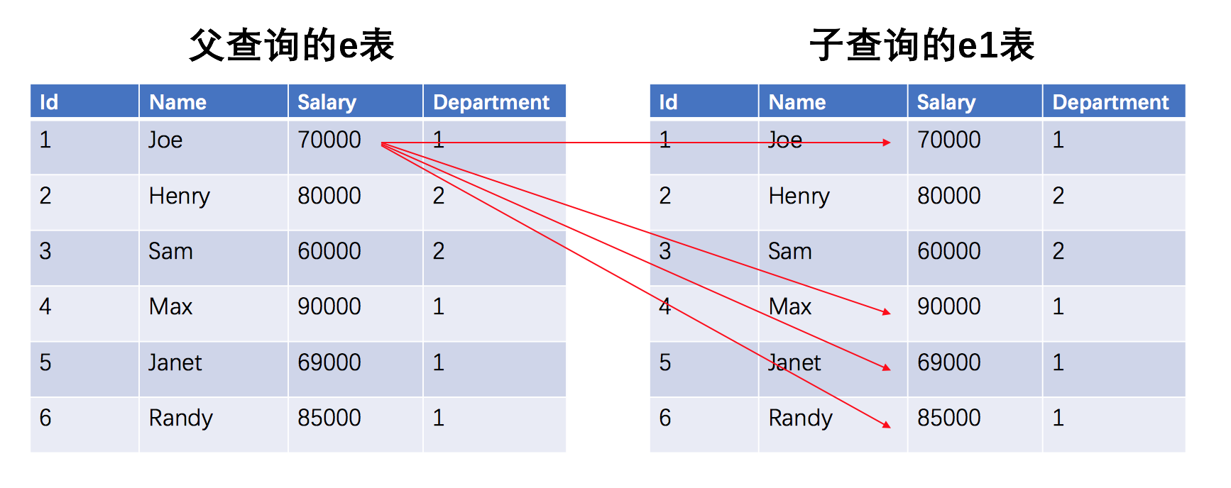 上述的例子巧妙地借用了子查询。在where语句中,我们用子表e1与父表(外表)e进行比对。SQL是允许子查询的表和父查询的表进行运算的。