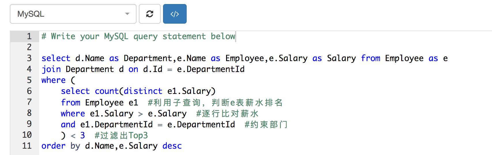 因为e1表和e表实际上是等价的。所以返回的count(distinct e1.Salary) 代表e1表有中多少薪水比e表的高,上图的例子,答案是2(90000和85000比它高)。如果是0,则代表e表中该行薪水最高(没有比它高的),1代表第二高,2代表第三高。于是便过滤出Top 3的薪水。最后通过join计算出结果。