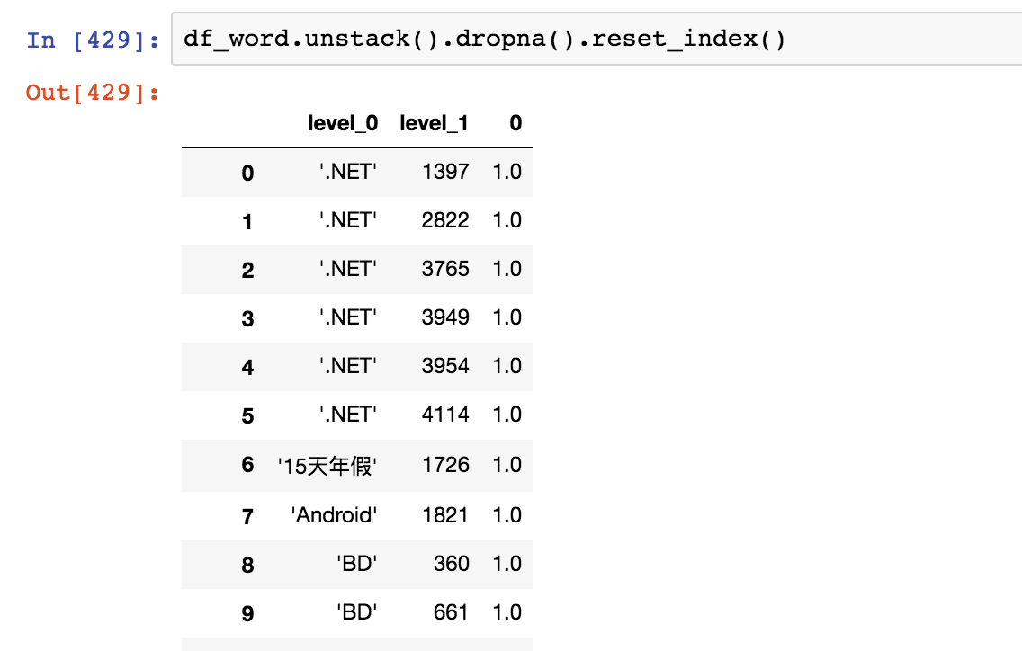 将空值删除,并且重置为DataFrame,此时level_0为标签名,level_1为df_index的索引,也可以认为它对应着一个职位,0是该标签在职位中出现的次数,之前我没有命名,所以才会显示0。部分职位的标签可能出现多次,这里忽略它。