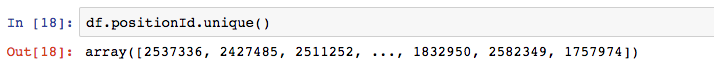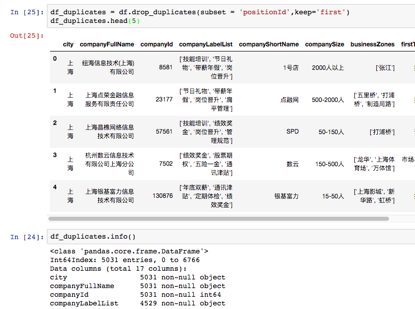 unique函数可以返回唯一值,数据集中positionId是职位ID,值唯一。配合len函数计算出唯一值共有5031个,说明有多出来的重复值。