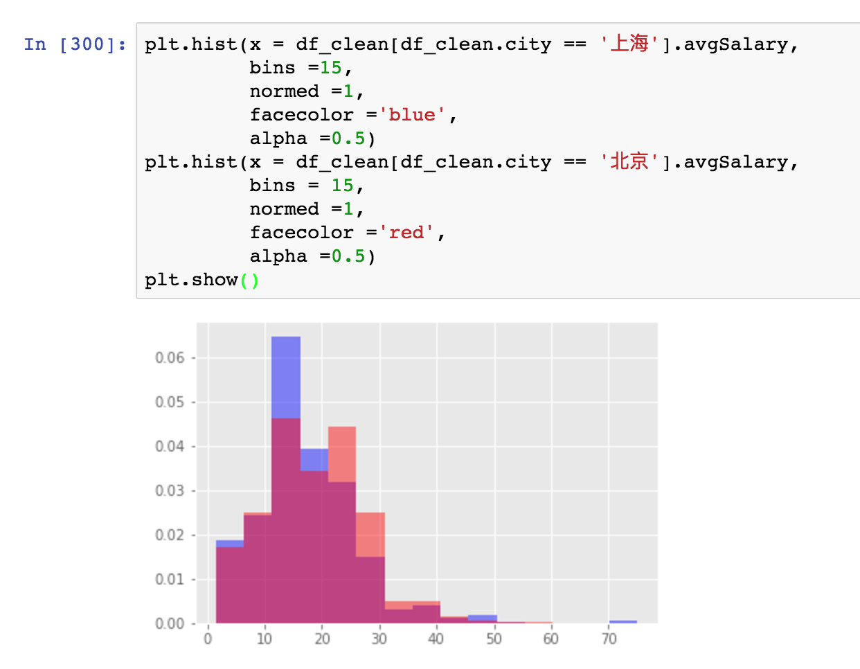 上图将上海和北京的薪资数据以直方图的形式进行对比。因为北京和上海的分析师人数相差较远,所以无法直接对比,需要用normed参数转化为密度。设置alpha透明度,它比箱线图更直观。