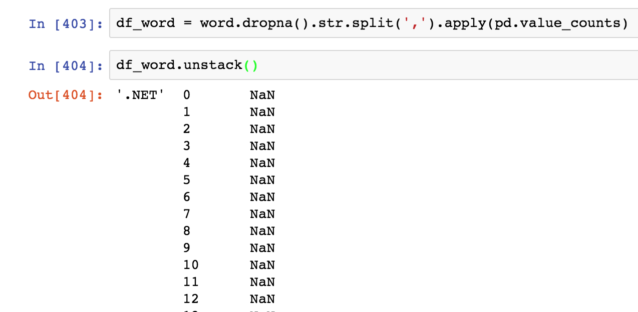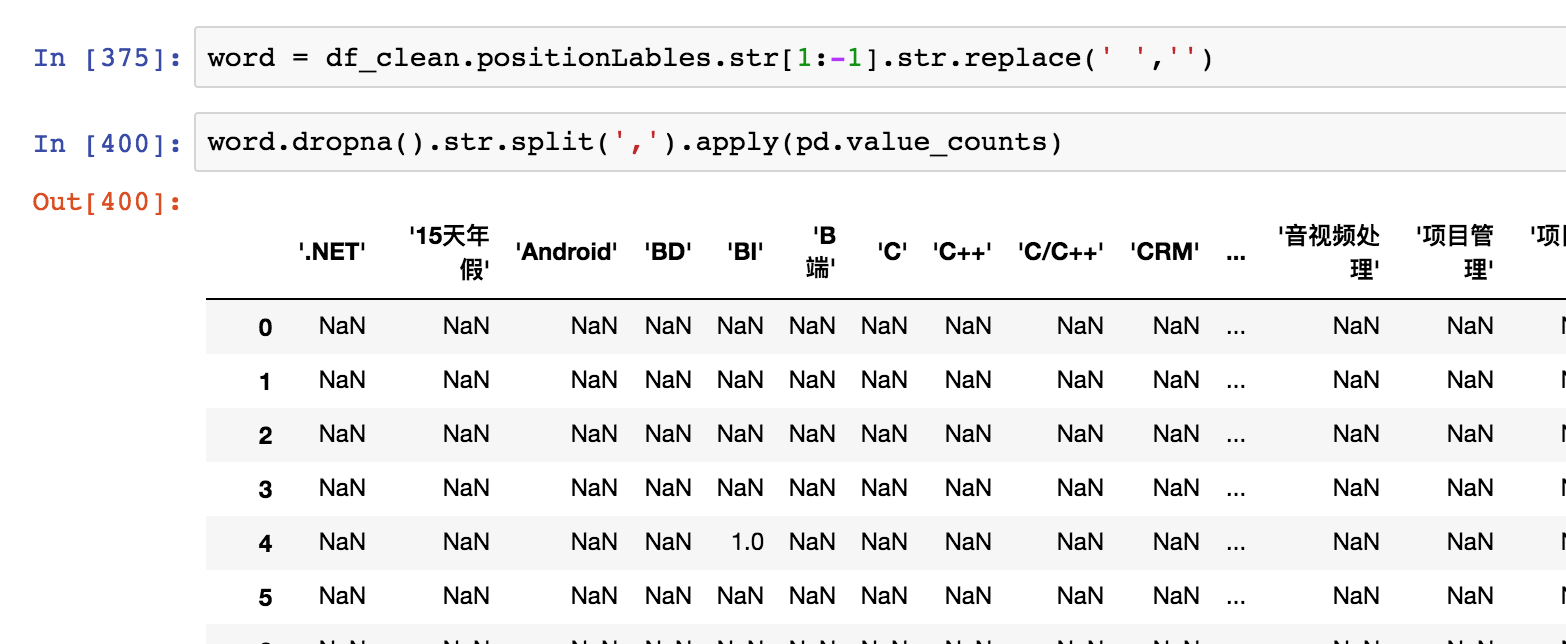 用unstack完成行列转换,看上去有点怪,因为它是统计所有标签在各个职位的出现次数,绝大多数肯定是NaN。