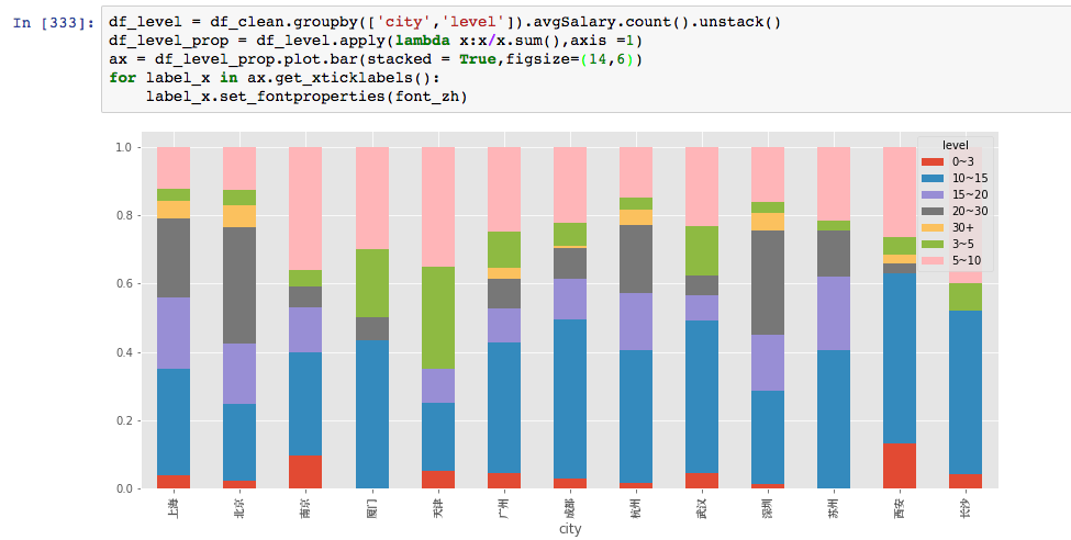 用lambda转换百分比,然后作堆积百分比柱形图(matplotlib好像没有直接调用的函数)。这里可以较为清晰的看到不同等级在不同地区的薪资占比。它比箱线图和直方图的好处在于,通过人工划分,具备业务含义。0~3是实习生的价位,3~6是刚毕业没有基础的新人,整理数据那种,6~10是有一定基础的,以此类推。