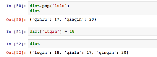 dict中删除key和list一样,通过pop函数。增加key则是直接赋予一个新的键值对。