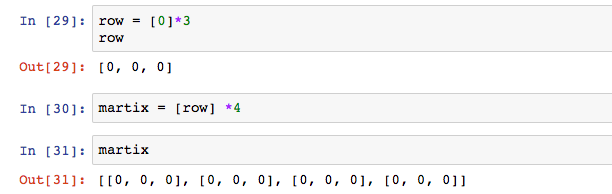 [0]*3将快速生成3个元素值为0的数组,这是一种快捷操作,而[row]*4则将其扩展成二维数据,因为是4,所以是3*4的结构。