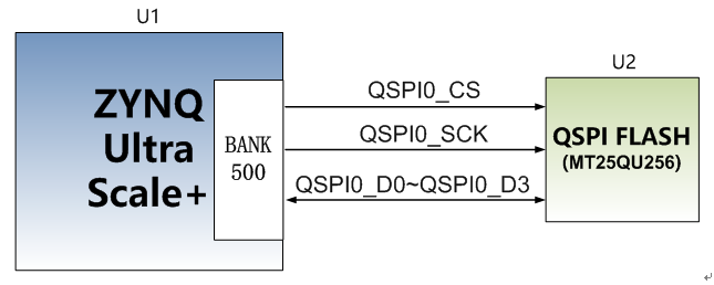 AXU2CGA/B配有1片256MBit大小的Quad-SPI FLASH芯片,型号为MT25QU256ABA1EW9-0SIT。QSPI FLASH连接到ZYNQ芯片的PS部分BANK500的GPIO口上,图4-1为QSPI Flash在原理图中的部分。