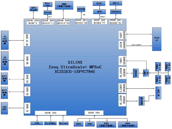 外围接口包含1个MINI DP接口、4个USB3.0接口、1路千兆以太网接口、1个USB串口、1路PCIE接口、1路TF卡接口、2个40针扩展口、2路MIPI接口和按键LED。