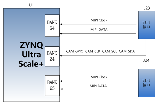 AXU2CGA/B板上有2路MIPI接口,用于连接MIPI摄像头。MIPI的差分信号分别连接到BANK64、65的HP IO上,电平标准为+1.2V;MIPI的控制信号连接到BANK24上,电平标准为+3.3V。 MIPI口设计的示意图如下图14-1所示: