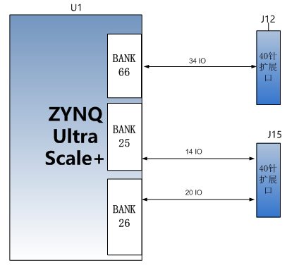 AXU2CGA/B板上预留了2个2.54mm标准间距的40针扩展口,每个扩展口均包含2个3.3V电源,1个5V电源,3个地以及34个IO口。J12扩展口的IO口连接到ZYNQ芯片BANK66上,电平标准为1.8V,注意不要插1.8V之外的设备。J15扩展口的IO口连接到ZYNQ芯片BANK25,BANK26上,电平标准为3.3V。设计的示意图如下图13-1所示: