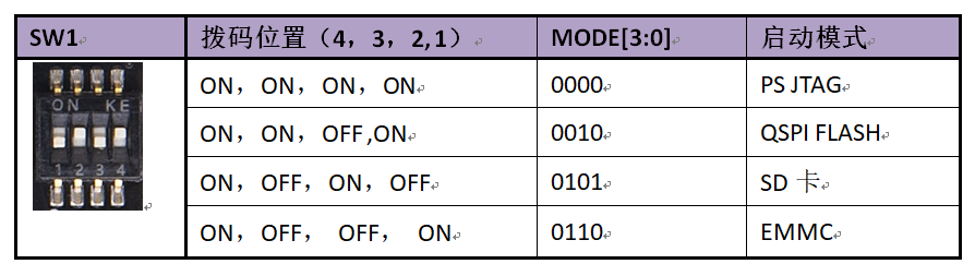 板上有一个4位的拨码开关用来配置ZYNQ系统的启动模式。AXU2CGA/B系统支持4种启动模式。这4种启动模式分别是JTAG调试模式,QSPI FLASH, EMMC和SD2.0卡启动模式。芯片上电后会检测(PS_MODE0~3)的电平来决定那种启动模式。用户可以通过拨码开关来选择不同的启动模式。SW1启动模式配置如下表17-1所示。
