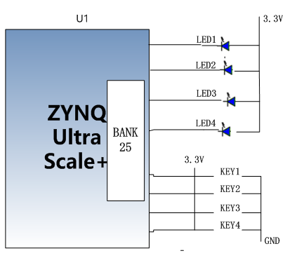 AXU2CGA/B的板上有4个用户指示灯,4个用户控制按键以及一个reset按键。4个用户指示灯和4个用户按键均连接到BANK24的IO上。LED灯硬件连接的示意图如图18-1所示: