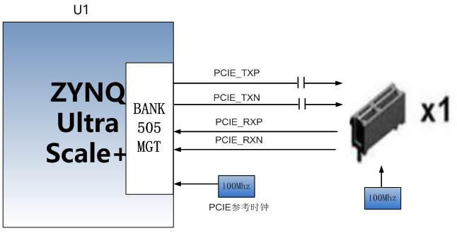 AXU2CGA/B配备了一个PCIE x1的插槽,用于连接PCIE外设,PCIE通信速度高达5Gbps。PCIE信号直接跟BANK505 PS MGT收发器的LANE0相连接。PCIE x 1设计的示意图如下图12-1所示: