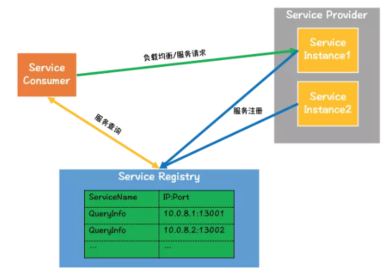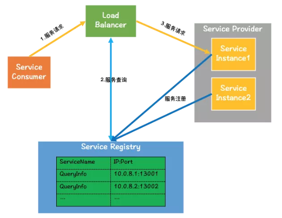 发现:服务消费者通过负载均衡器发送服务请求,负载均衡器会查询服务注册表,挑选一个服务实例,并将请求转发到服务实例。
