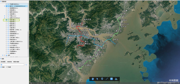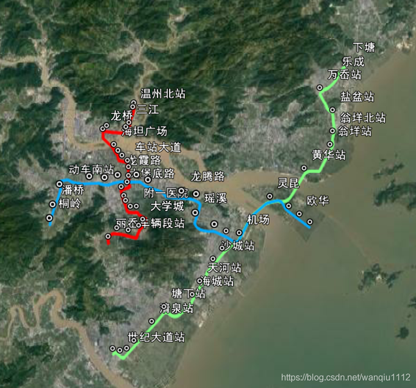 小编自行绘制的温州轨道交通S1、S2、M1的线站位图,叠加的是谷歌卫星影像。