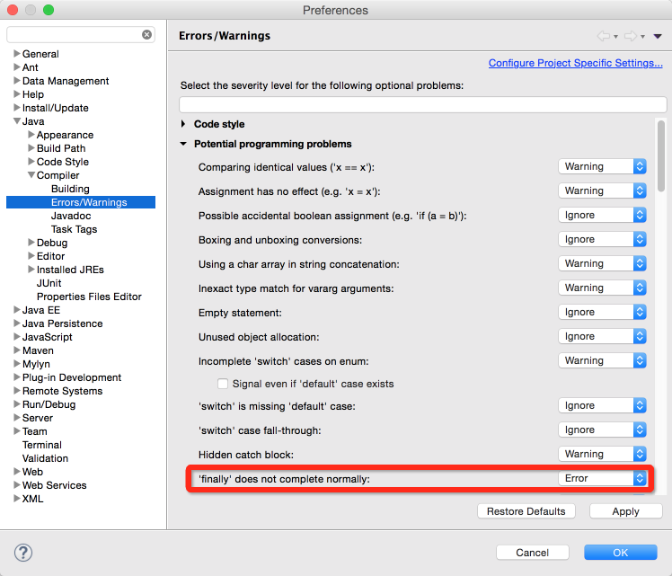 注意:在finally中改变返回值的做法是不好的,因为如果存在finally代码块,try中的return语句不会立马返回调用者,而是记录下返回值待finally代码块执行完毕之后再向调用者返回其值,然后如果在finally中修改了返回值,就会返回修改后的值。显然,在finally中返回或者修改返回值会对程序造成很大的困扰,C#中直接用编译错误的方式来阻止程序员干这种龌龊的事情,Java中也可以通过提升编译器的语法检查级别来产生警告或错误,Eclipse中可以在如图所示的地方进行设置,强烈建议将此项设置为编译错误。