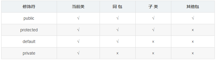 类的成员不写访问修饰时默认为default。默认对于同一个包中的其他类相当于公开(public),对于不是同一个包中的其他类相当于私有(private)。受保护(protected)对子类相当于公开,对不是同一包中的没有父子关系的类相当于私有。Java中,外部类的修饰符只能是public或默认,类的成员(包括内部类)的修饰符可以是以上四种。
