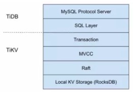 TiDB 架构是 SQL 层和 KV 存储层分离,相当于 InnoDB 插件存储引擎与 MySQL 的关系。从下图可以看出整个系统是高度分层的,最底层选用了当前比较流行的存储引擎 RocksDB,RockDB 性能很好但是是单机的,为了保证高可用所以写多份(一般为 3 份),上层使用 Raft 协议来保证单机失效后数据不丢失不出错。保证有了比较安全的 KV 存储的基础上再去构建多版本,再去构建分布式事务,这样就构成了存储层 TiKV。有了 TiKV,TiDB 层只需要实现 SQL 层,再加上 MySQL 协议的支持,应用程序就能像访问 MySQL 那样去访问 TiDB 了。