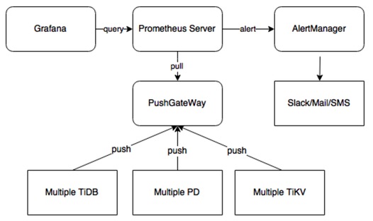 Pincap 团队给 TiDB 提供了一整套监控的方案,他们使用开源时序数据库 Prometheus 作为监控和性能指标信息存储方案,使用 Grafana 作为可视化组件进行展示。具体如下图,在 client 端程序中定制需要的 Metric 。Push GateWay 来接收 Client Push 上来的数据,统一供 Prometheus 主服务器抓取。AlertManager 用来实现报警机制,使用 Grafana 来进行展示。