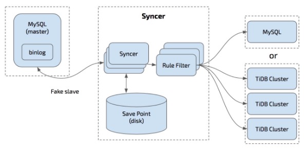 根据MySQL binlog增量同步工具,Syncer 可以部署在任一台可以连通对应的 MySQL 和 TiDB 集群的机器上,推荐部署在 TiDB 集群。
