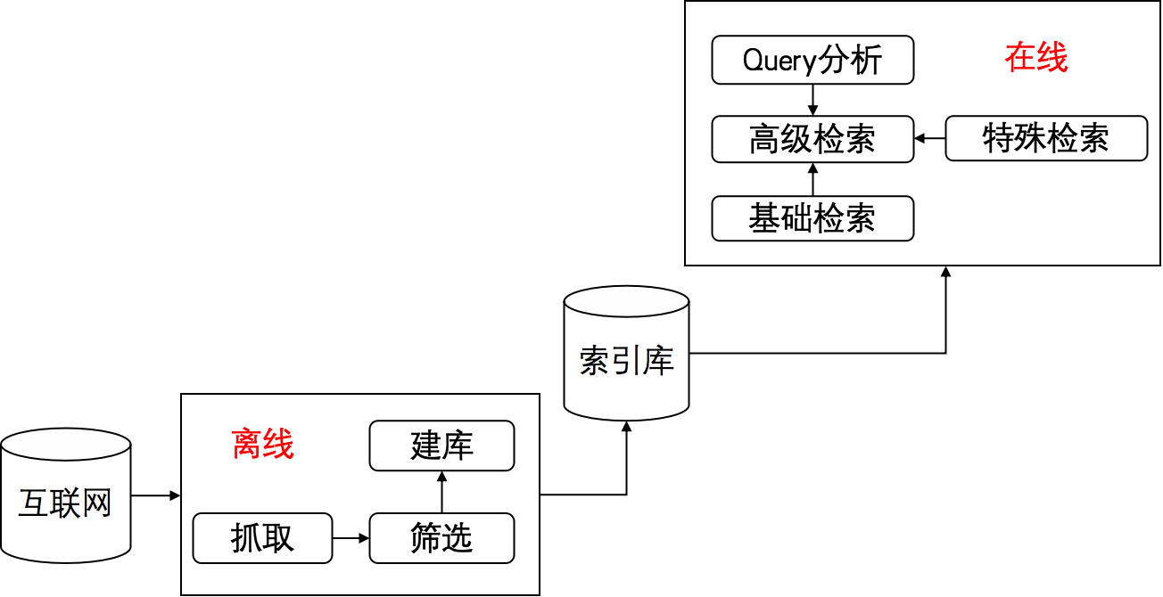 一个基本的搜索引擎系统主要由离线(建库)和在线(检索)两部分构成,离线侧主要完成“网页获取——网页分析——建倒排索引库”的过程,在线侧主要完成“query获取——query处理——与doc进行相关性匹配”的过程。首先给出一个全貌图: