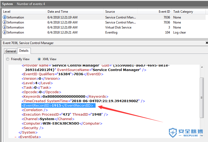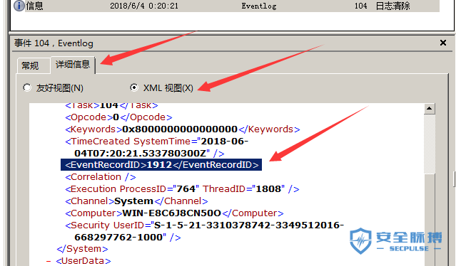 值得注意的是EventRecordID标签,用来表示日志的顺序号