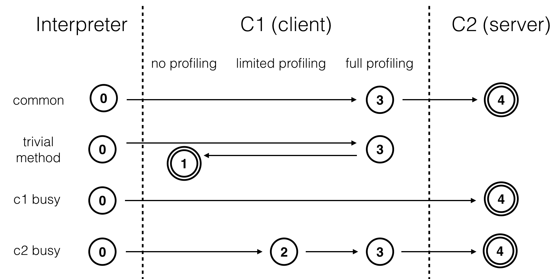- JVM将在0层、2层和3层执行状态时进行profiling,其中包括方法的调用次数和循环回边的执行次数