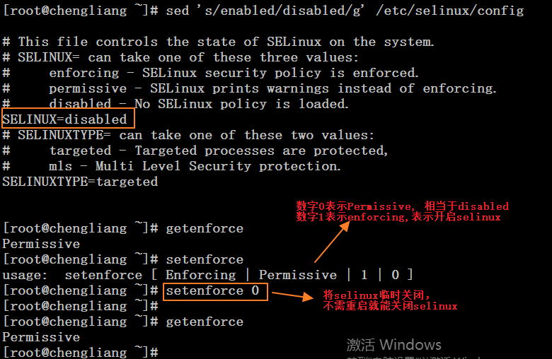 提示:修改配置SElinux后,要想使生效,必须要重启系统。因此,可配合使用setenforce 0 这个临时关闭的命令,这样在重启前后都可以使得SElinux关闭生效了,也就是说无需立刻重启服务器了,在生产环境下Linux机器是不能随意重启。