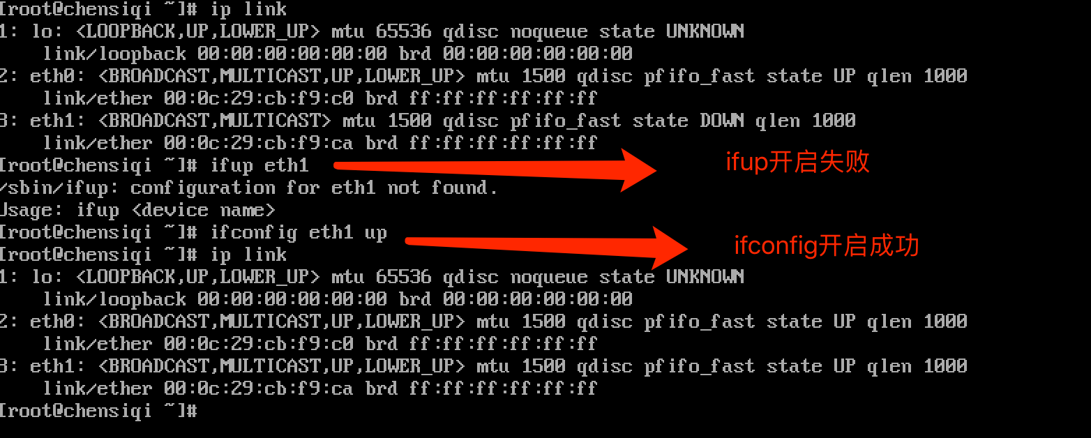 方法一:ifup + 网卡名(ethx) 可以开启设备