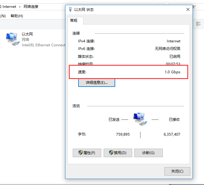1)首先要确保PC的网卡速度为千兆,否则无法显示。在网络连接中找到本地以太网, 双击出现如下界面,千兆网络默认连接如下图: