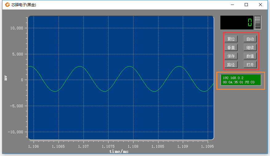 4)下载程序,调节信号发生的频率和幅度,AN706输入范围-5V-5V,因此幅度最大设置为10Vpp,为了便于观察波形数据,建议信号输入频率50hz到10Khz。打开示波器.exe即可自动显示波形。此实验不需要设置PC的IP地址,用千兆网线连接PC和开发板即可。