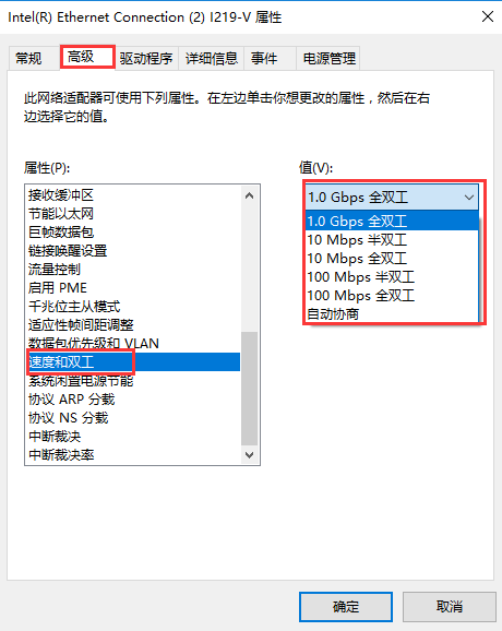 在链接速度中,可以看到目前的链接状态是多大速度,可在下拉菜单中查找链接选项,务必确保链接速度为1.0Gbps 全双工,如果没有这个选项,说明网卡不支持千兆以太网。