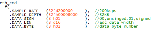 注意:上位机设置的缓存空间为1M字节,请求数据间隔为100ms,因此在设置采样深度时要考虑到这两点。在eth_top.v程序中设置为32\'h00008000,即32K字节,采样频率为200KHz,ADC采样端数据为两个字节长度,因此采样长度为采样字节除以2,即32’h00004000,计算需要82ms可采集完成。移除了UDP发送数据的检验和。