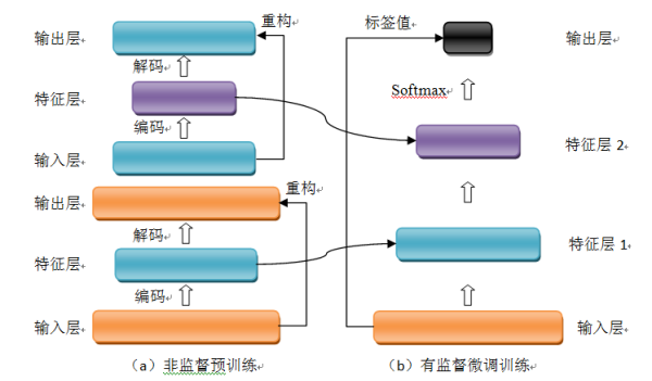 堆叠自编码器与普通神经网络不同之处在于其训练过程,该网络结构训练主要分两步:非监督预训练和有监督微调训练。