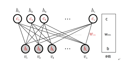 一个普通的RBM网络结构如上图所示,是一个双层模型,由m个可见层单元及n个隐层单元组成,其中,层内神经元无连接,层间神经元全连接,也就是说:在给定可见层状态时,隐层的激活状态条件独立,反之,当给定隐层状态时,可见层的激活状态条件独立。这保证了层内神经元之间的条件独立性,降低概率分布计算及训练的复杂度。RBM可以被视为一个无向图模型,可见层神经元与隐层神经元之间的连接权重是双向的,即可见层到隐层的连接权重为W,则隐层到可见层的连接权重为W’。除以上提及的参数外,RBM的参数还包括可见层偏置b及隐层偏置c。