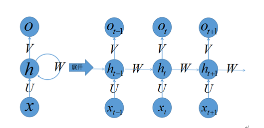我们可以看到在隐含层节点之间增加了互连。为了分析方便,我们常将RNN在时间上进行展开,得到如图6所示的结构: