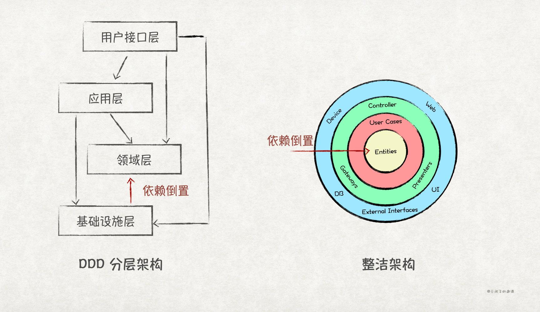 另外,DIP不仅仅适用于模块/类/接口设计,在架构层面也同样适用,比如DDD的分层架构和Uncle Bob的整洁架构,都是运用了DIP:
