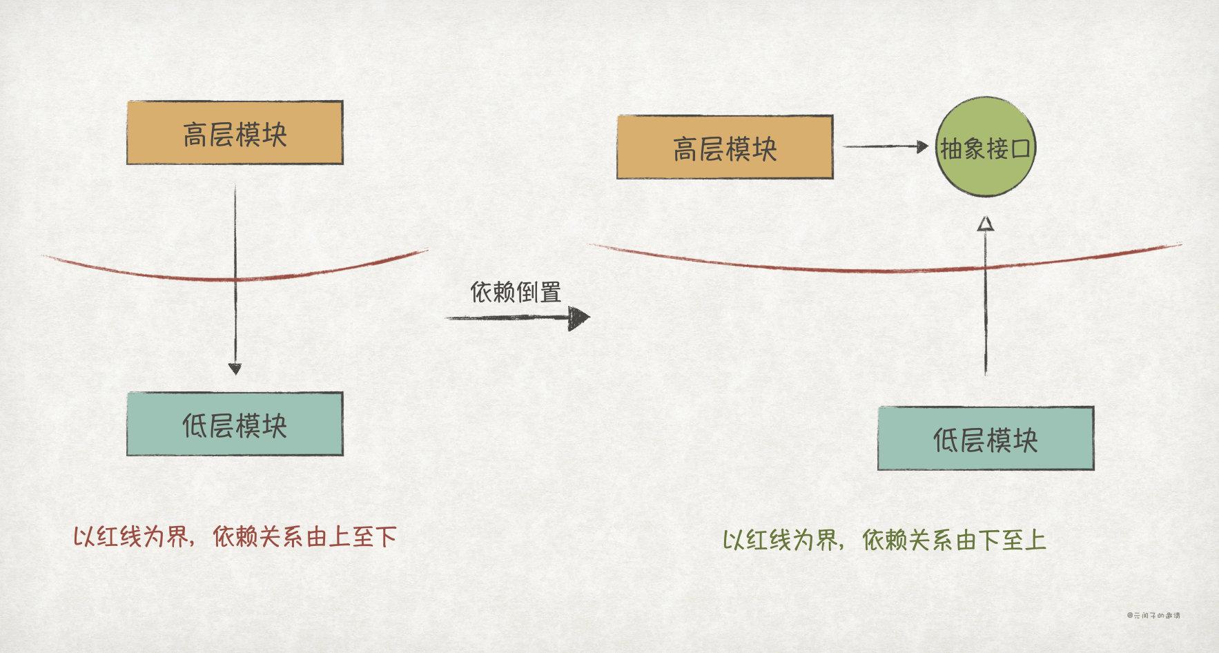 理解DIP的关键在于第1点,按照我们正向的思维,高层模块要借助低层模块来完成业务,这必然会导致高层模块依赖低层模块。但是在软件领域里,我们可以把这个依赖关系倒置过来,这其中的关键就是抽象。我们可以忽略掉低层模块的细节,抽象出一个稳定的接口,然后让高层模块依赖该接口,同时让低层模块实现该接口,从而实现了依赖关系的倒置: