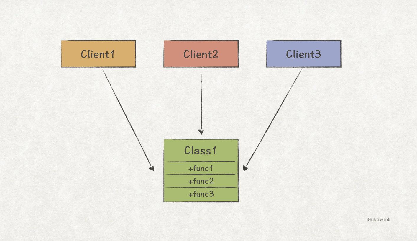 - 产生接口污染,假设开发Client1的程序员,在写代码时不小心把func1打成了func2,那么就会带来Client1的行为异常。也即Client1被func2给污染了。